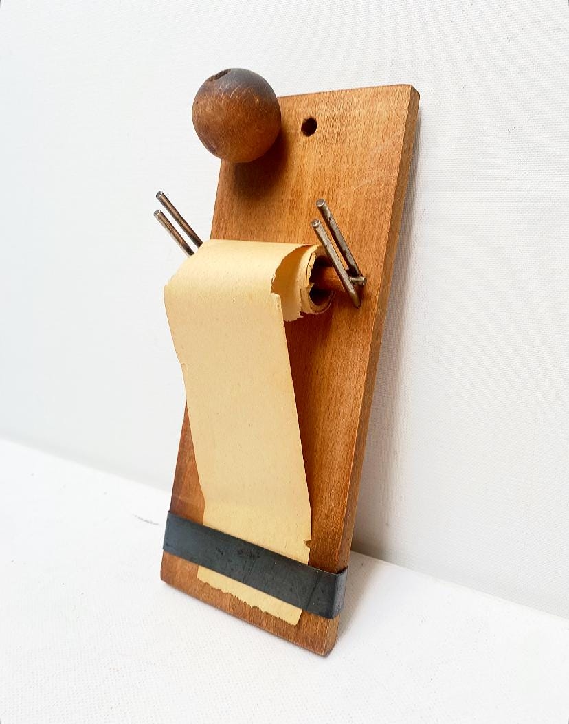 Decorative wooden memo holder for attaching a roll of paper.