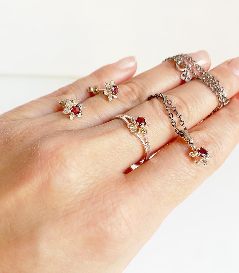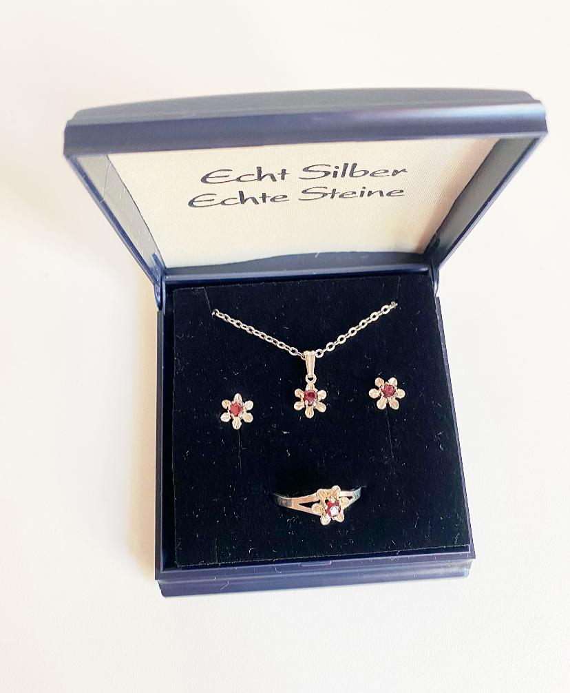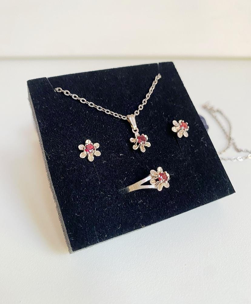 Charming jewelry set in 835 silver, consisting of a necklace, earrings, and a ring.