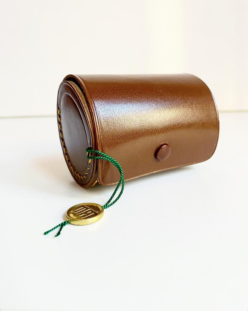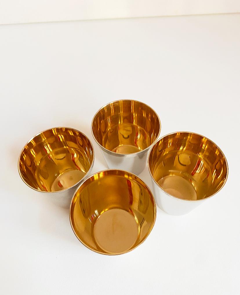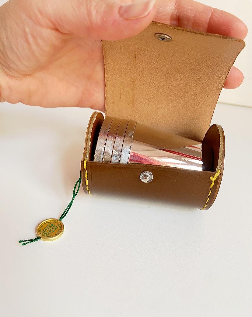 Vintage leather case containing four stainless steel shot glasses for small drinks.